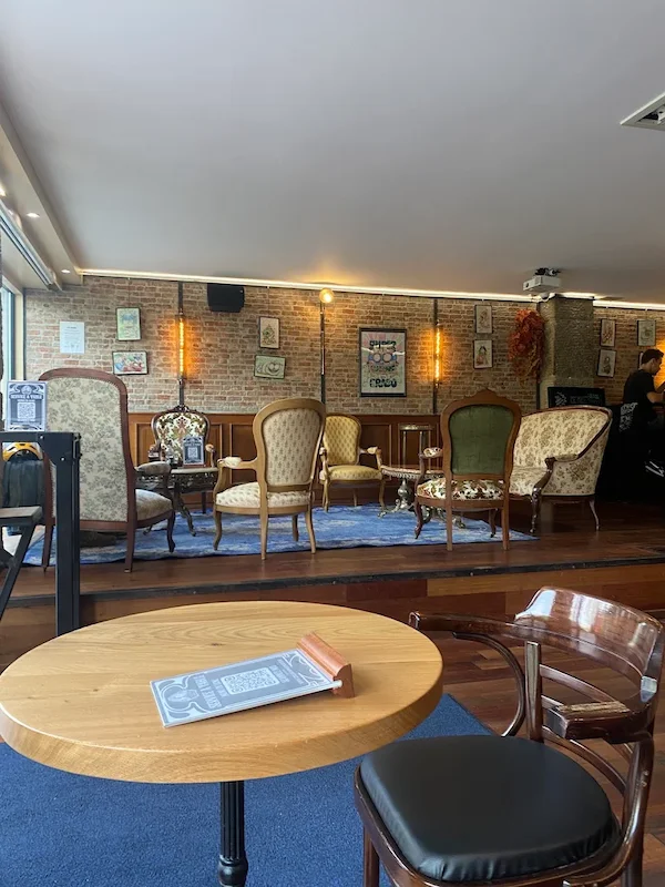 L’arrière-bar est une pièce d’exception : ossature acier et inox, habillage en plaques gravées par découpe laser, surmontée d’un plateau bois massif et zinc. Les banquettes ont été réalisées en acier et cuir, offrant robustesse et confort.