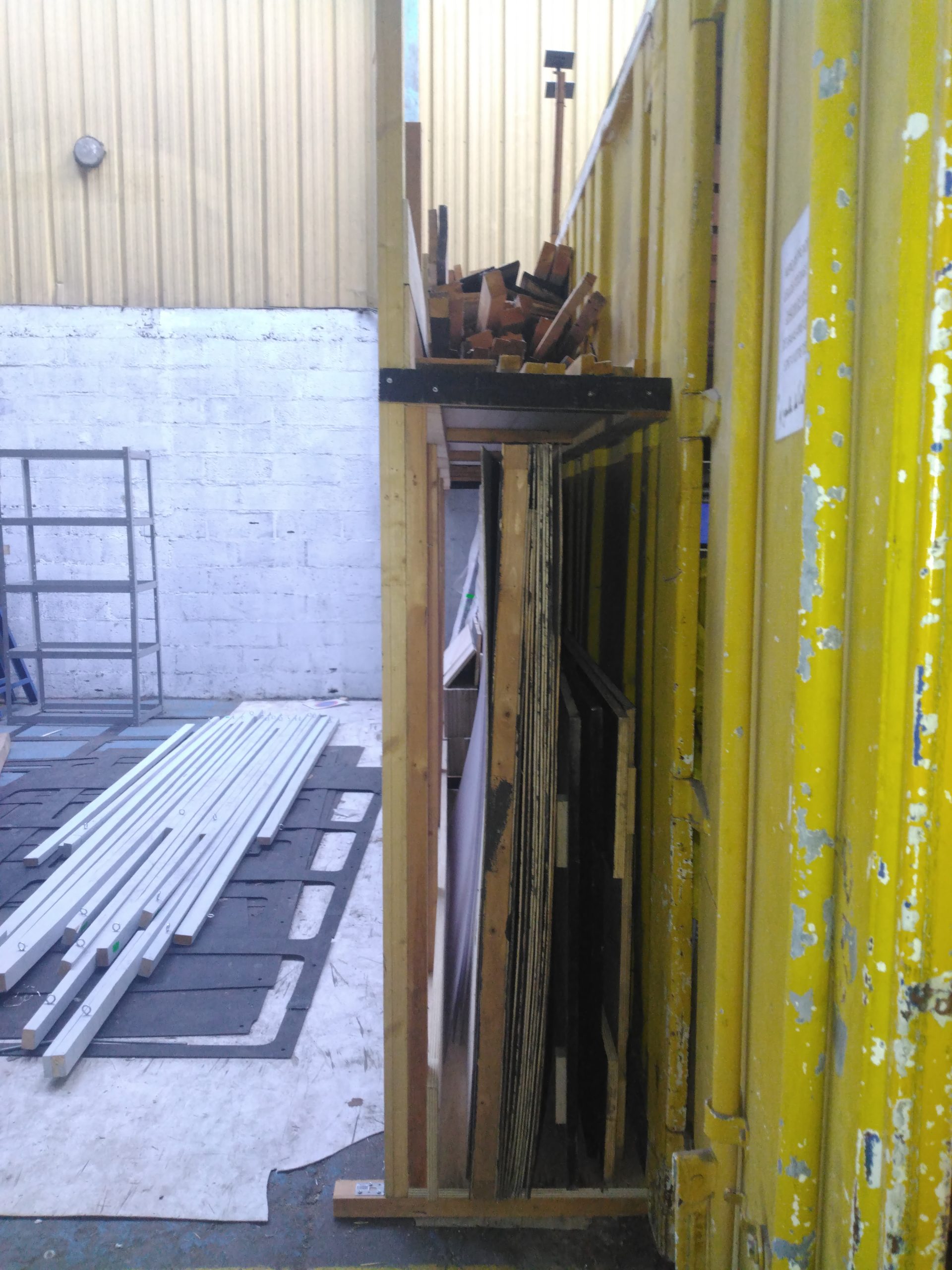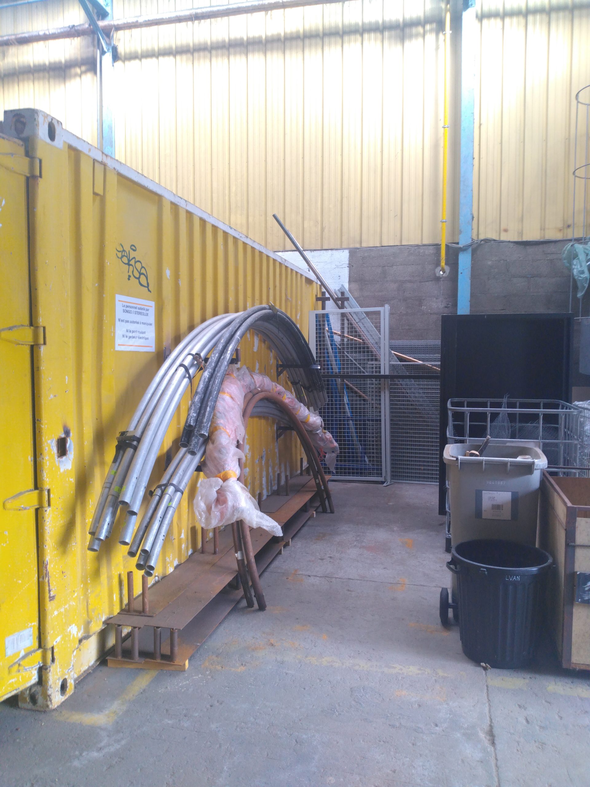 Le premier container a été transformé en salle d’archivage, intégrant des solutions de protection pour documents et matériaux sensibles. Le second a été conçu comme espace de stockage dédié aux décors, éléments de scénographie et accessoires. Les interventions ont porté sur l’adaptation des structures métalliques existantes par des découpes contrôlées, des renforts localisés, une ventilation efficace et une isolation partielle ciblée. Des rayonnages en acier galvanisé réglables ont été installés afin d’optimiser les volumes et d’assurer une modularité d’usage. Un éclairage LED basse consommation garantit confort et sécurité dans un environnement initialement non prévu pour l’exploitation humaine.