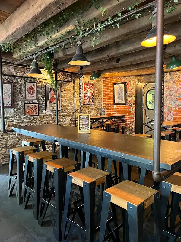 Conception et fabrication de mobiliers sur mesure pour bars, restaurants et espaces culturels : comptoirs, banquettes, structures décoratives, éclairages, éléments scéniques ou modulables.