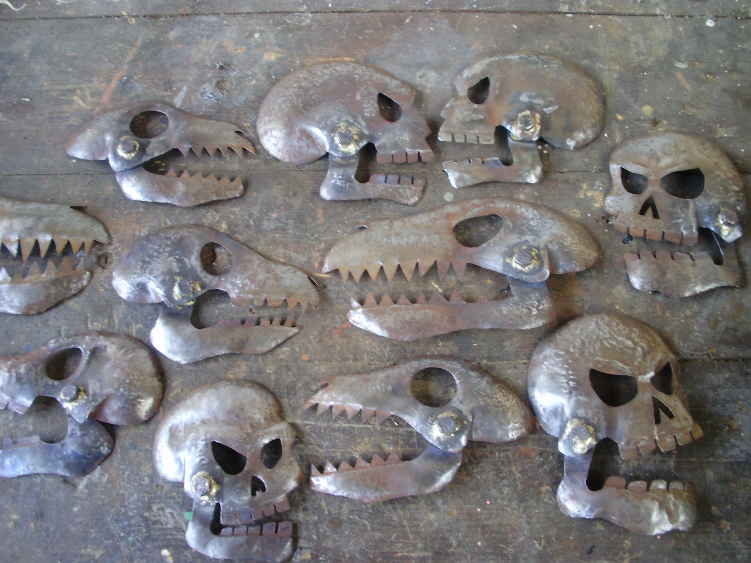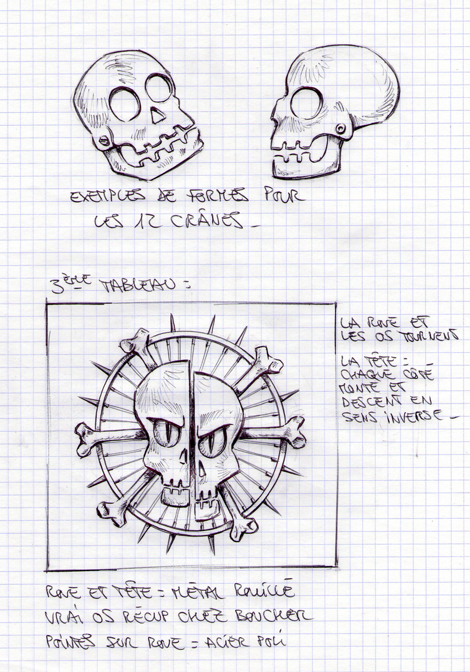 - Tôles acier martelées et embouties suspendues par câbles inox.