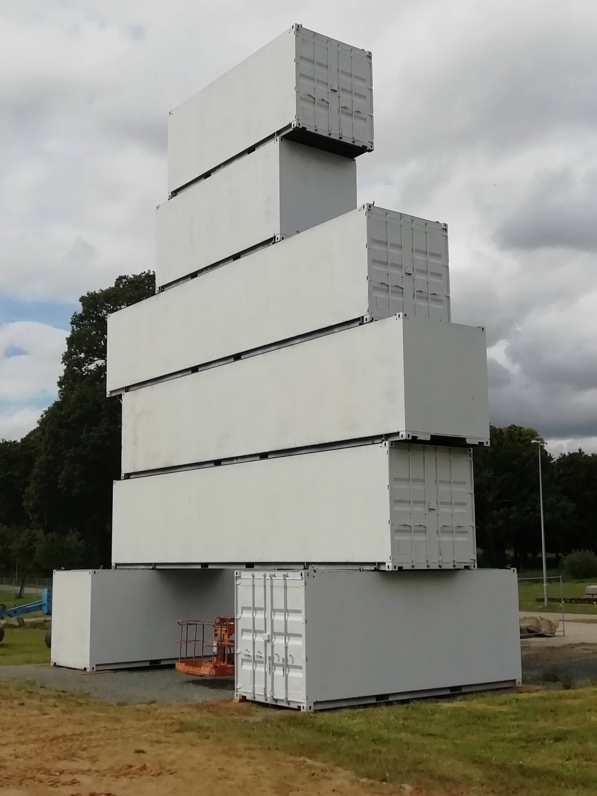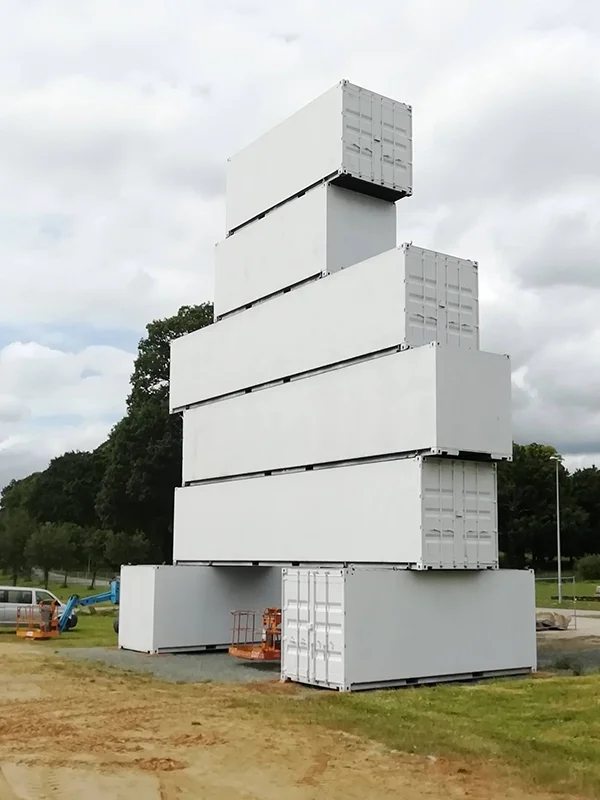 Pour le festival des Vieilles Charrues, nous avons relevé un défi architectural et logistique : ériger une sculpture monumentale de type Totem, de 17 mètres de haut composée de containers maritimes.