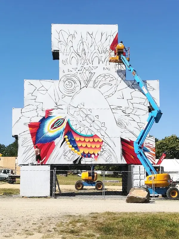 Après avoir recouvert les façades de plaques de dibond, l’habillage de la sculpture a été confié au collectif d’artistes +2Couleurs, qui a graphé l’intégralité du Totem selon la DA du festival, transformant la masse brute en œuvre d’art lumineuse et colorée.